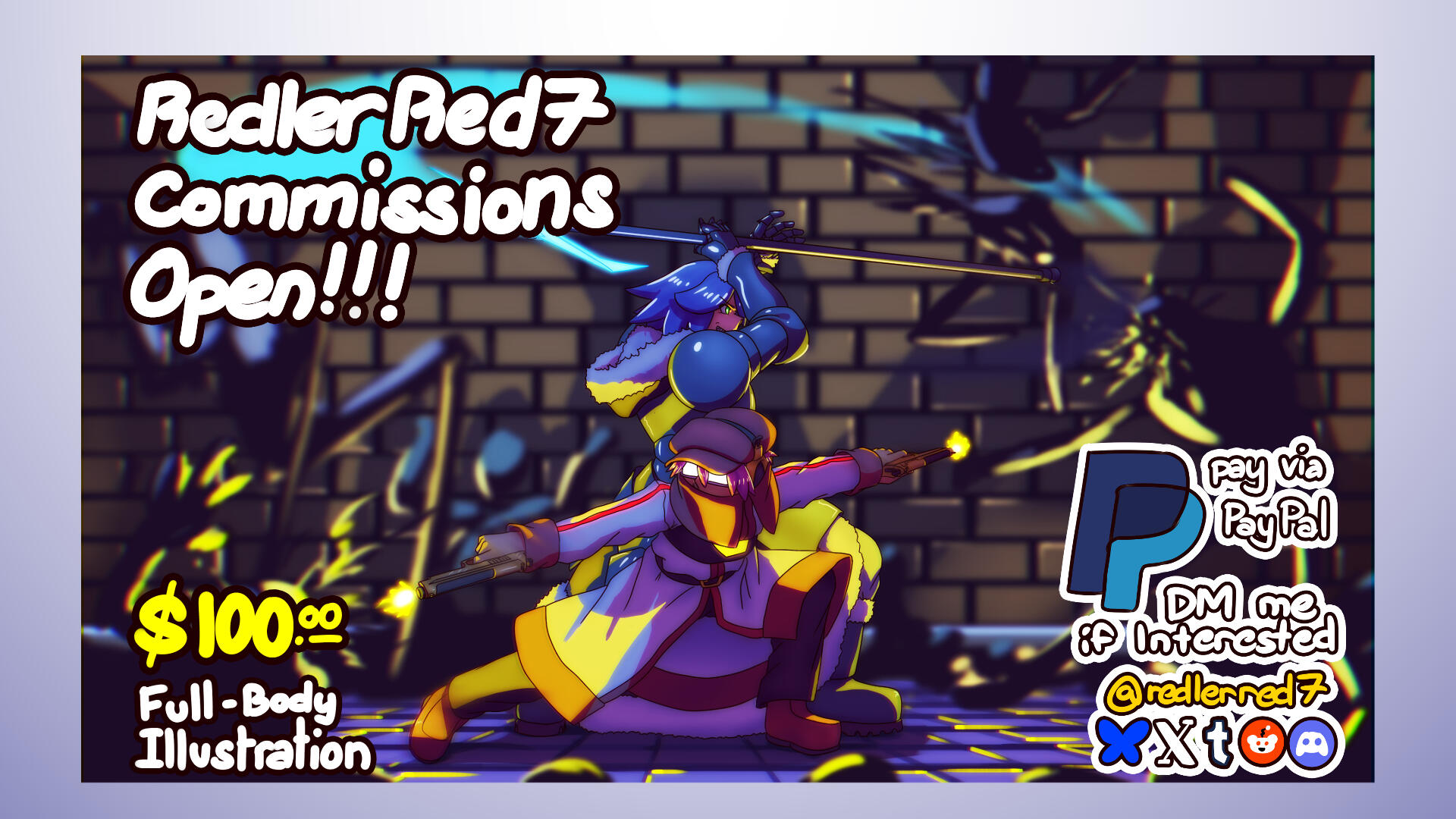 If you are interested in commissioning me, please contact me via E-mail ([email protected]), or through DMs on BlueSky (redlerred7.bsky.social), Tumblr (redlerred7.tumblr.com), or Discord (@redlerred7). When contacting me, please clearly state that you wish to commission me and what you'd like me to draw. I will reply to negotiate terms. Typically, my rates are 100 USD per illustration, though actual prices may be higher or lower depending on what is being asked of me. If we are both in agreement, then I will request your payment information. Currently, the only payment method I can accept is via PayPal invoice (which can be paid via PayPal, Stripe, and Debit/Credit card)I require payment before I start working on a commission:At least 50% partial payment upfront, with the remaining 50% upon delivery of the artwork.